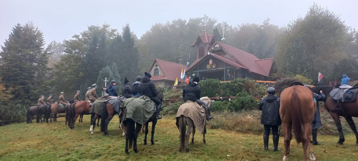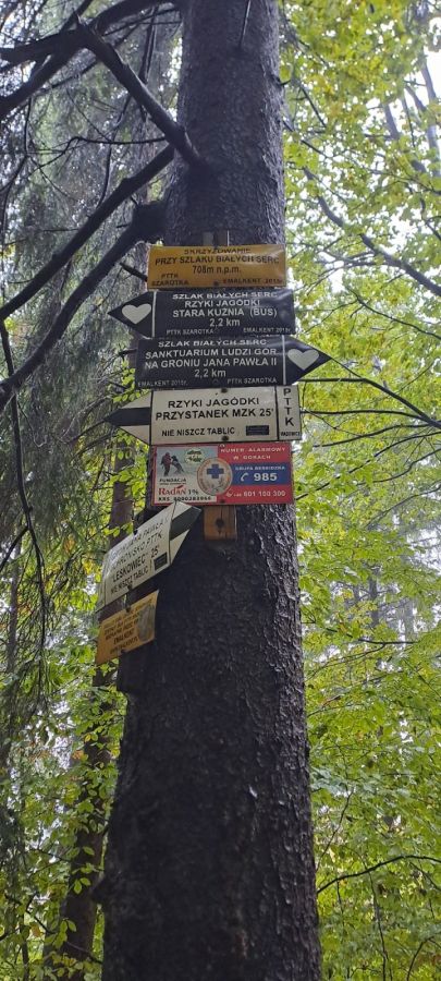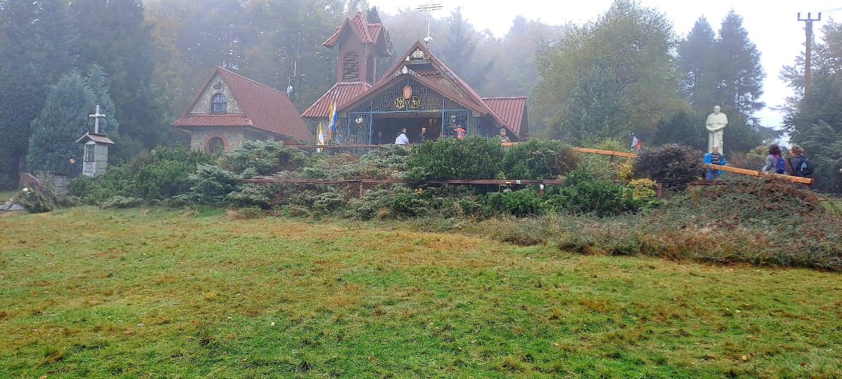 W grupie 17 osób wyjechaliśmy z Zakopanego przy drobnej mżawce. Po drodze pogoda nieco się poprawiła, tak, że całą wycieczkę udało się odbyć przy niezłych warunkach. Po dojechaniu do miejscowości Rzyki, uwzględniając wielkość grupy i busa, udało się podjechać do ostatniego osiedla, tuż pod początek szlaku. Dalej stromym czarnym szlakiem 14 osób weszło najpierw na przełęcz W.Midowicza (866 m npm), a następnie na szczyt Leskowca (922 m npm). Niestety nie było widoczności i nie udało się zobaczyć rozległej panoramy sięgającej Tatr. Po wykonaniu grupowej fotografii zeszliśmy do schroniska, gdzie była zarządzona dłuższa przerwa. Tam dołączyły też trzy osoby, które szły szlakiem Białych Serc. Przy schronisku wykonaliśmy zdjęcia zbiorowe i po zwiedzeniu przyległej kaplicy Ludzi Gór, gdzie odbywała się msza święta z okazji dnia papieskiego, w asyście banderii konnej, przez szczyty: Groń Jana Pawła II (890 m npm) i Gancarz (798 m npm) zeszliśmy do centrum wsi Rzyki. W drodze powrotnej zatrzymaliśmy się w Wadowicach na świąteczne kremówki papieskie i szczęśliwie wróciliśmy do Zakopanego.