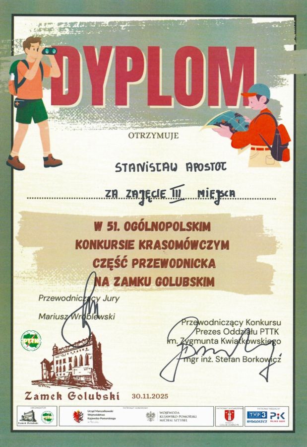 Nasz kolega Stanisław Apostoł wystąpił w zmaganiach 51. Ogólnopolskiego Konkursu Krasomówczego Przewodników Turystycznych, który odbył się w dniach 28 - 30 listopada na zamku w Golubiu-Dobrzyniu (woj. kujawsko-pomorskie). A oto Jego relacja z udziału w Konkursie: