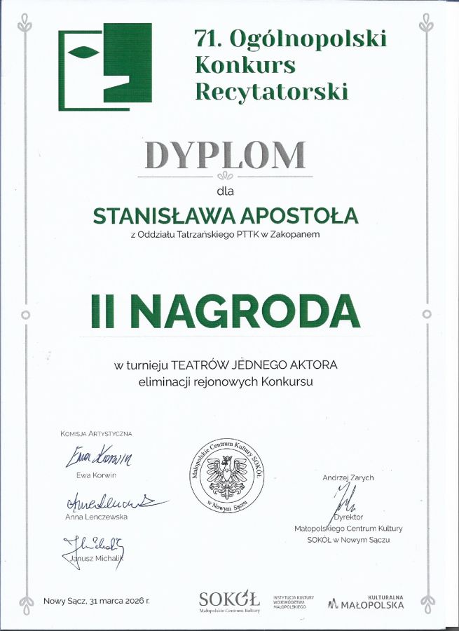 Kolega Staszek Apostoł reprezentował nasz Oddział w Eliminacjach Rejonowych 71. Ogólnopolskiego Konkursu Recytatorskiego, który miał miejsce 31 marca w Nowym Sączu.