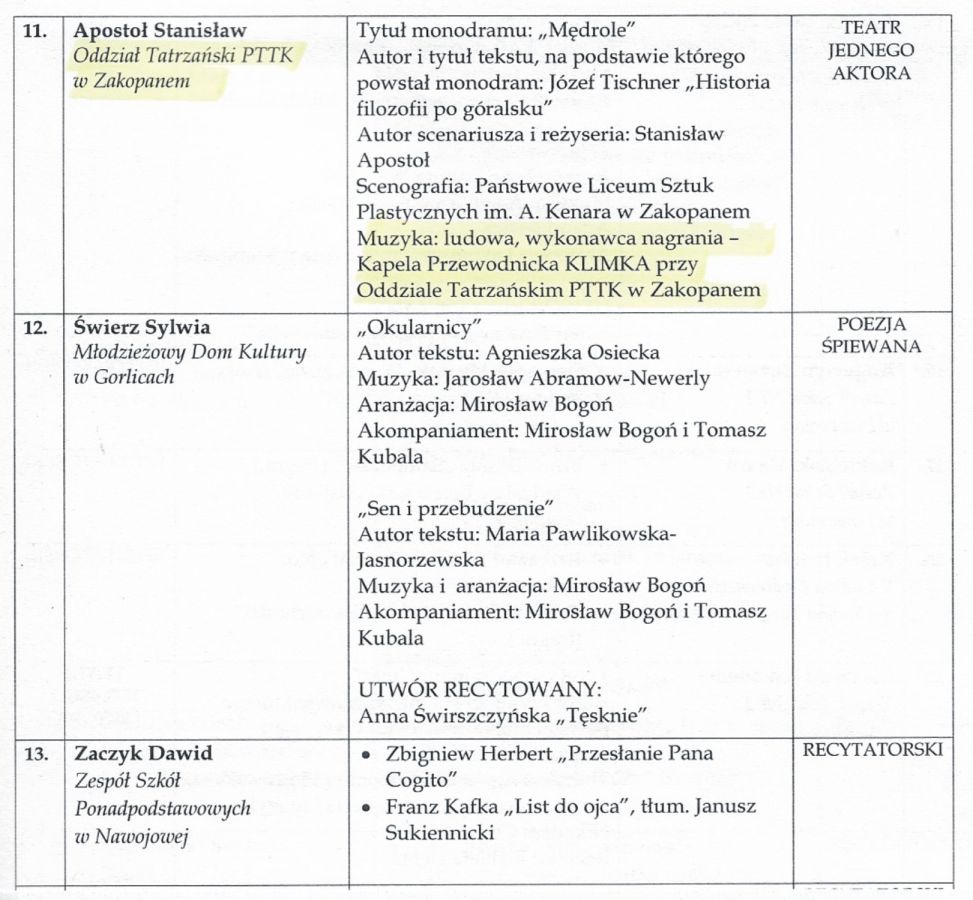 Oprawę plastyczną do monodramu wykonali uczniowie Państwowego Liceum Sztuk Plastycznych im. A. Kenara w Zakopanem, a oprawę muzyczną (w formie nagrania) Kapela Przewodnicka KLIMKA, działająca przy naszym Oddziale. Fakty te zostały odnotowane w załączonym programie Eliminacji.