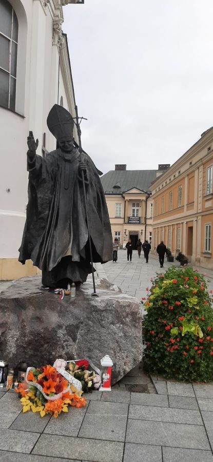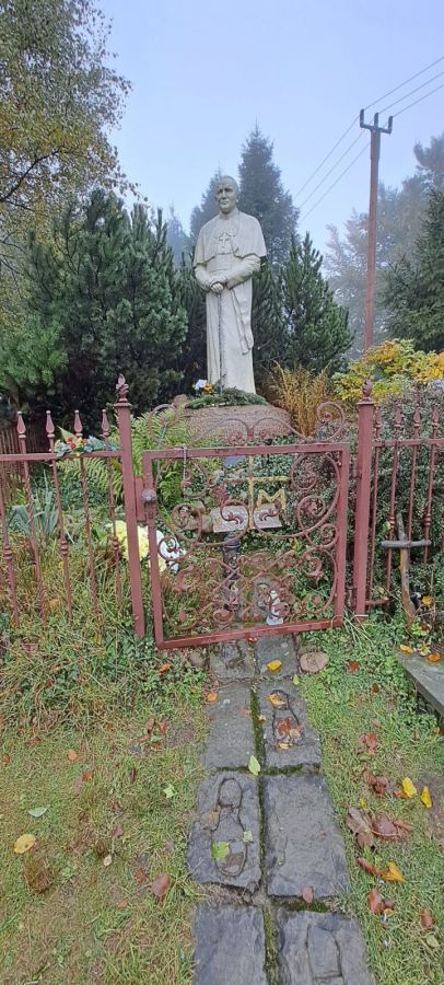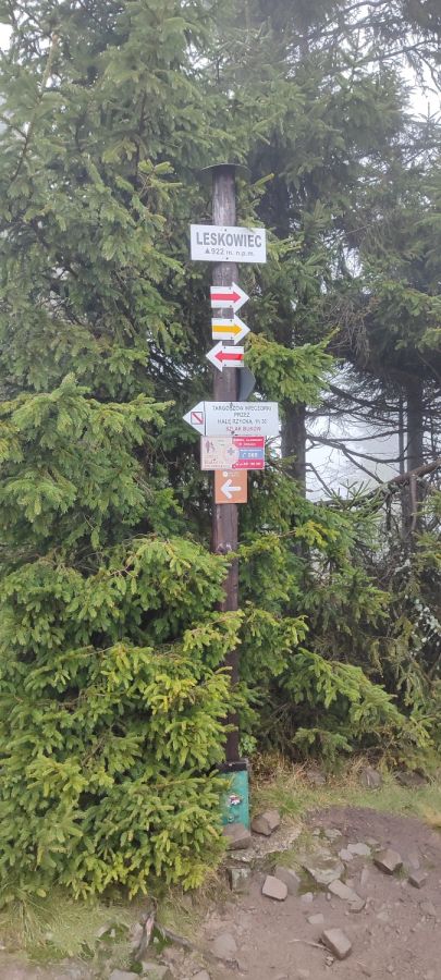 W grupie 17 osób wyjechaliśmy z Zakopanego przy drobnej mżawce. Po drodze pogoda nieco się poprawiła, tak, że całą wycieczkę udało się odbyć przy niezłych warunkach. Po dojechaniu do miejscowości Rzyki, uwzględniając wielkość grupy i busa, udało się podjechać do ostatniego osiedla, tuż pod początek szlaku. Dalej stromym czarnym szlakiem 14 osób weszło najpierw na przełęcz W.Midowicza (866 m npm), a następnie na szczyt Leskowca (922 m npm). Niestety nie było widoczności i nie udało się zobaczyć rozległej panoramy sięgającej Tatr. Po wykonaniu grupowej fotografii zeszliśmy do schroniska, gdzie była zarządzona dłuższa przerwa. Tam dołączyły też trzy osoby, które szły szlakiem Białych Serc. Przy schronisku wykonaliśmy zdjęcia zbiorowe i po zwiedzeniu przyległej kaplicy Ludzi Gór, gdzie odbywała się msza święta z okazji dnia papieskiego, w asyście banderii konnej, przez szczyty: Groń Jana Pawła II (890 m npm) i Gancarz (798 m npm) zeszliśmy do centrum wsi Rzyki. W drodze powrotnej zatrzymaliśmy się w Wadowicach na świąteczne kremówki papieskie i szczęśliwie wróciliśmy do Zakopanego.